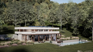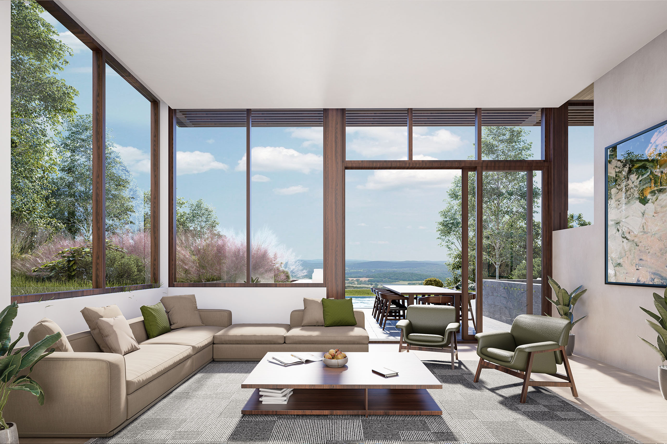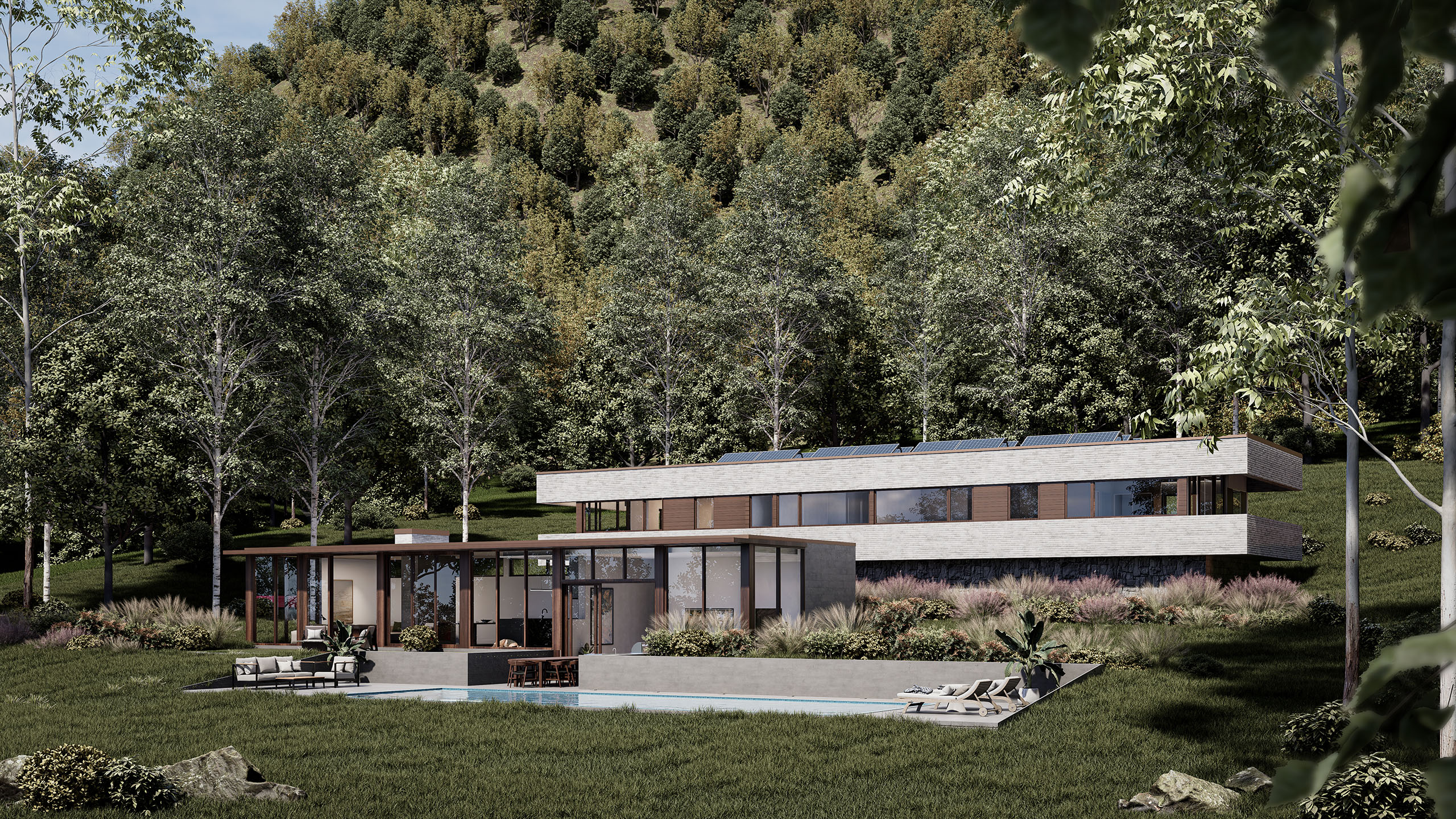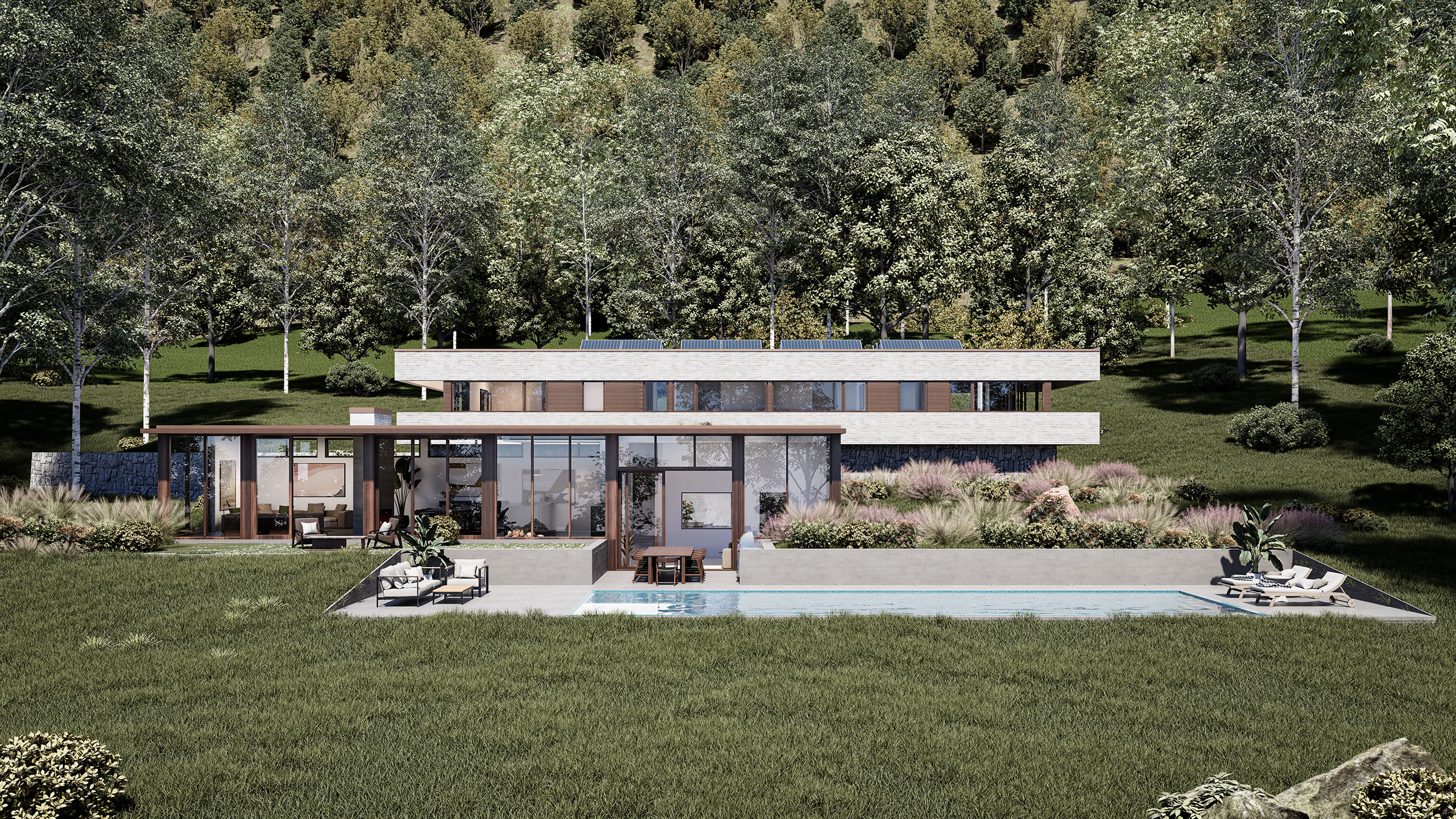 The house consists of three volumes, each with a distinct purpose. The upper volume, containing private bedrooms, is wrapped in masonry and gently floats above the landscape. The central volume, dedicated to social spaces, is enclosed in floor-to-ceiling glass, connecting the interior to the surroundings. The lower volume, set into the earth and clad in stone, contains the pool. These volumes cascade down the mountainside, offering unobstructed views of the stunning vistas.