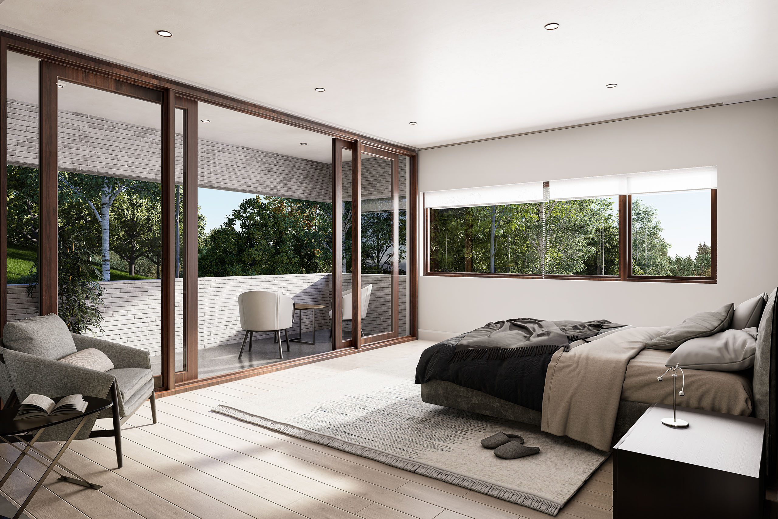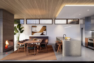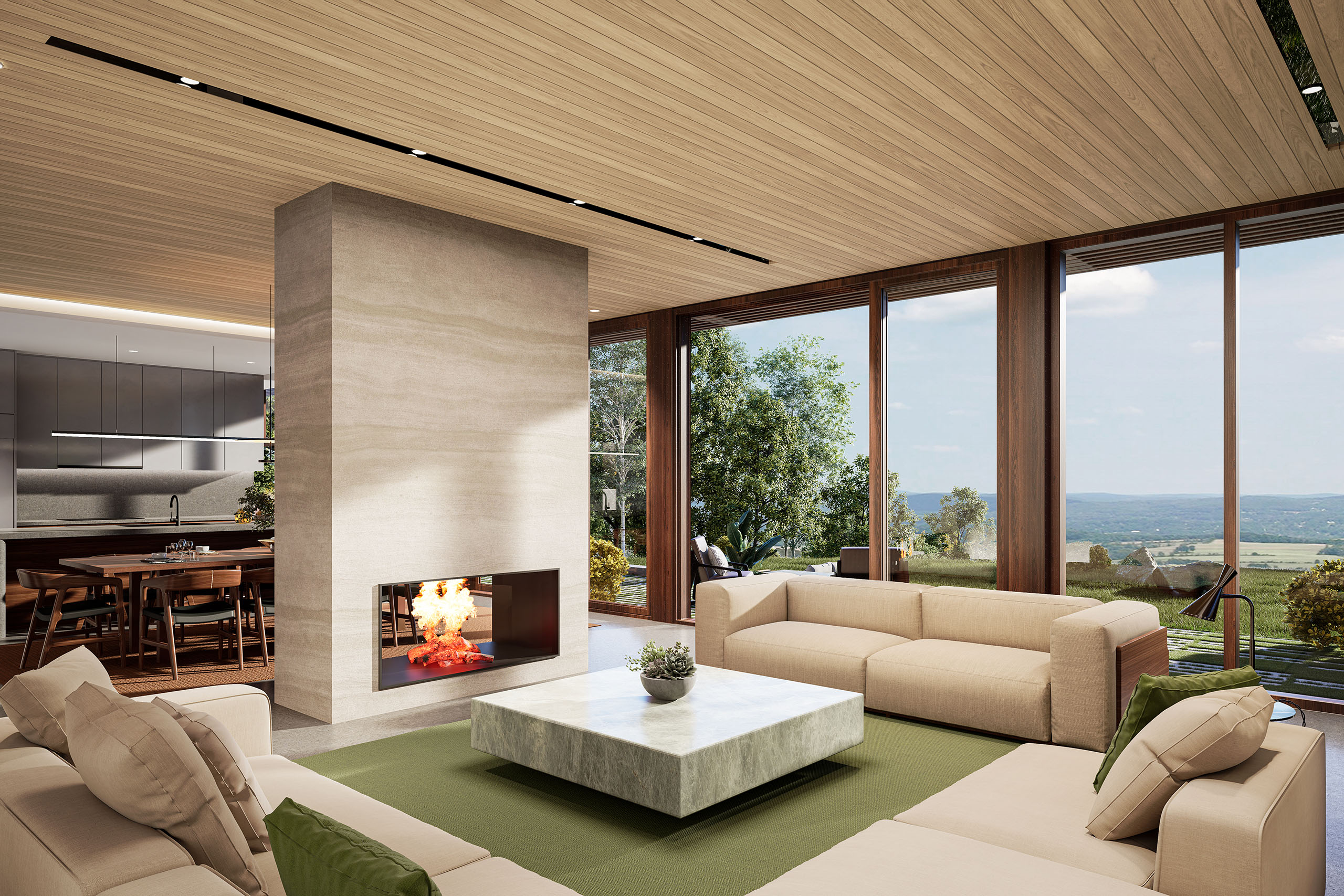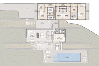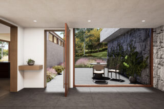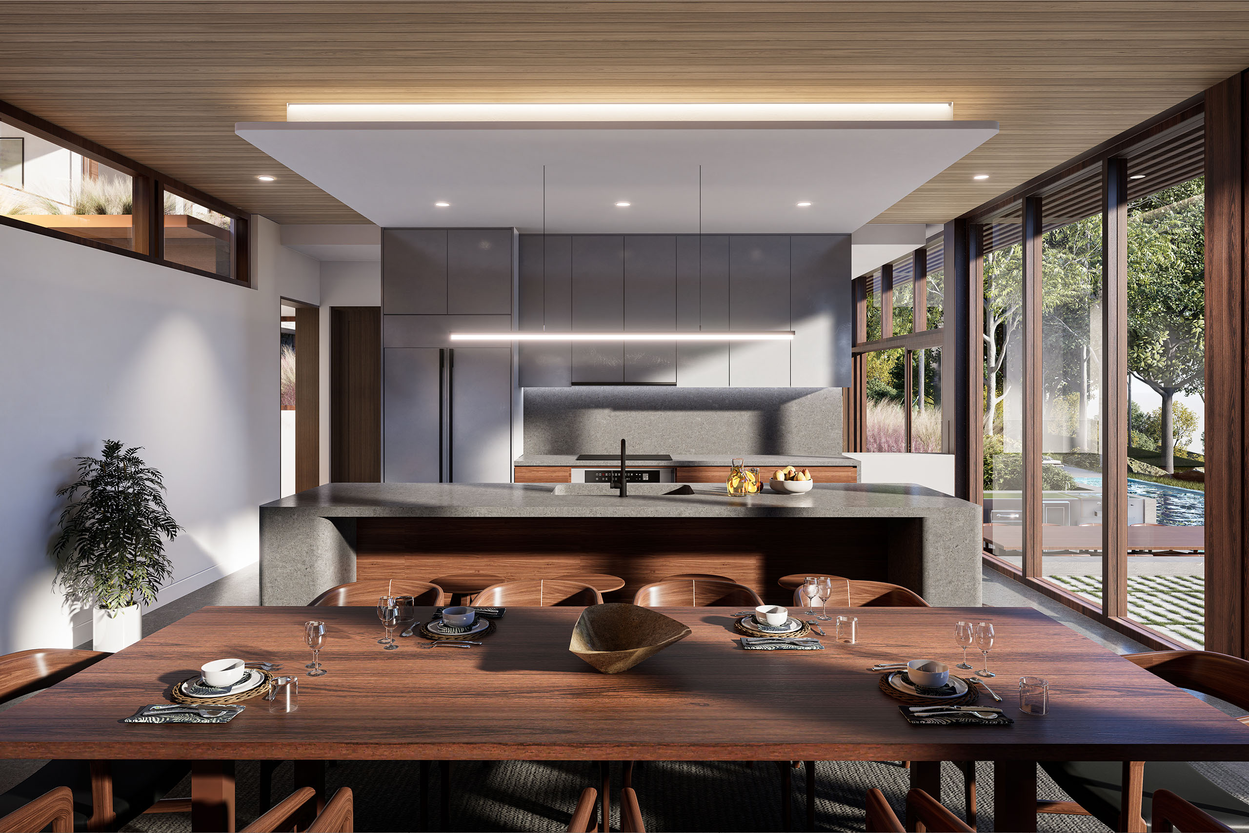 Between each volume is a buffer zone defined by a signature landscape feature, offering essential exterior programming and visual interest. The upper landscape includes specialty plantings framing the entry court and a sloping hill partially covers the foyer. The lower landscape features green pavers, allowing the living room to flow outdoors through operable doors to seating and dining areas. This space connects to a sunken outdoor kitchen, which leads to the poo deck.