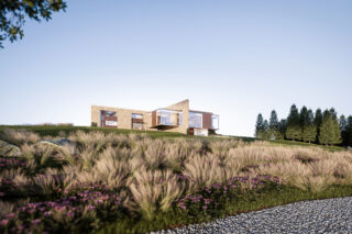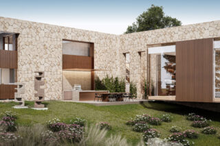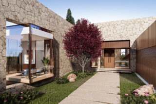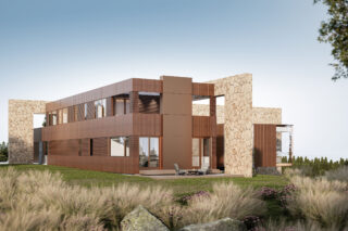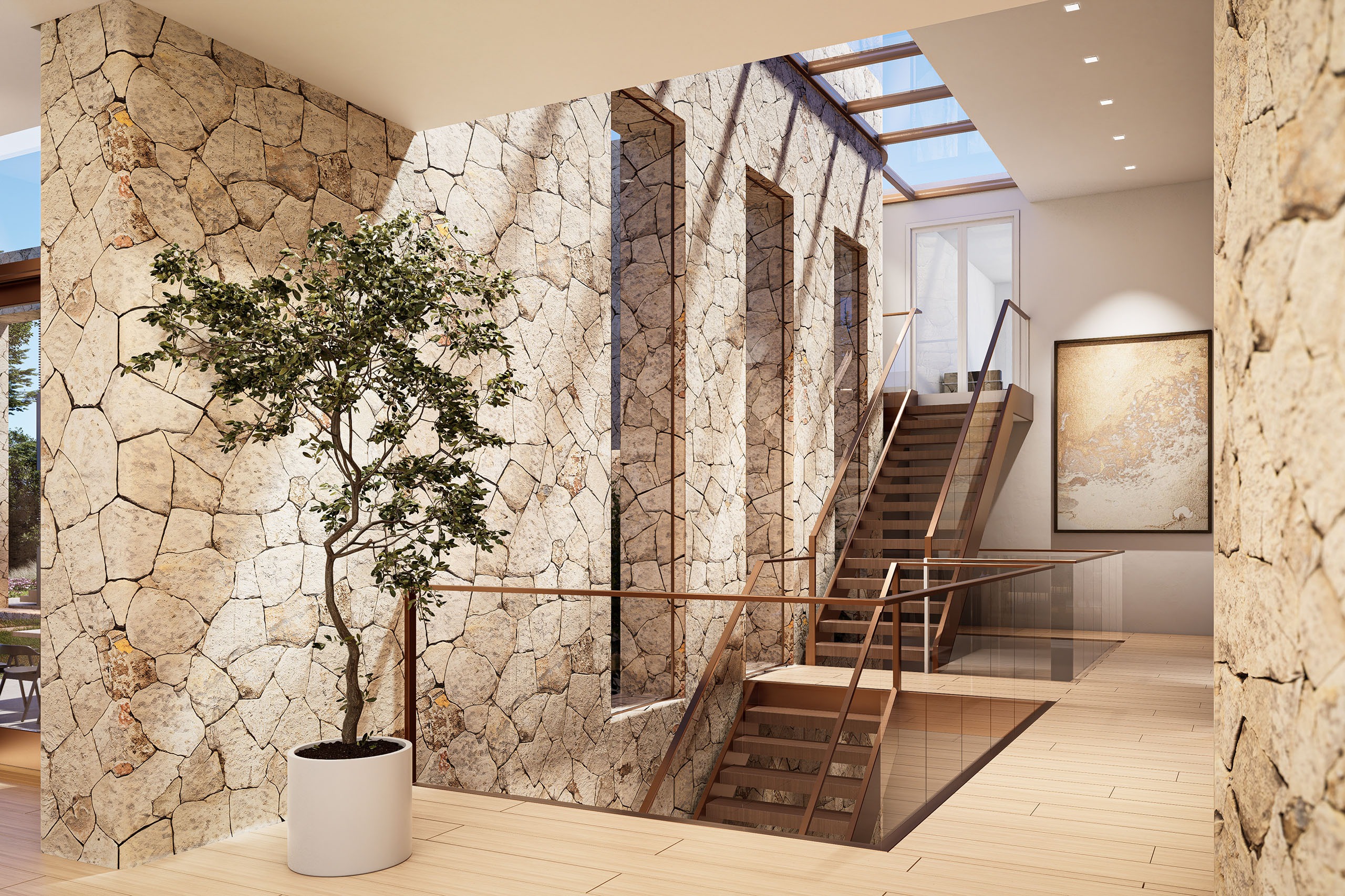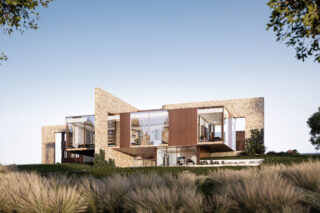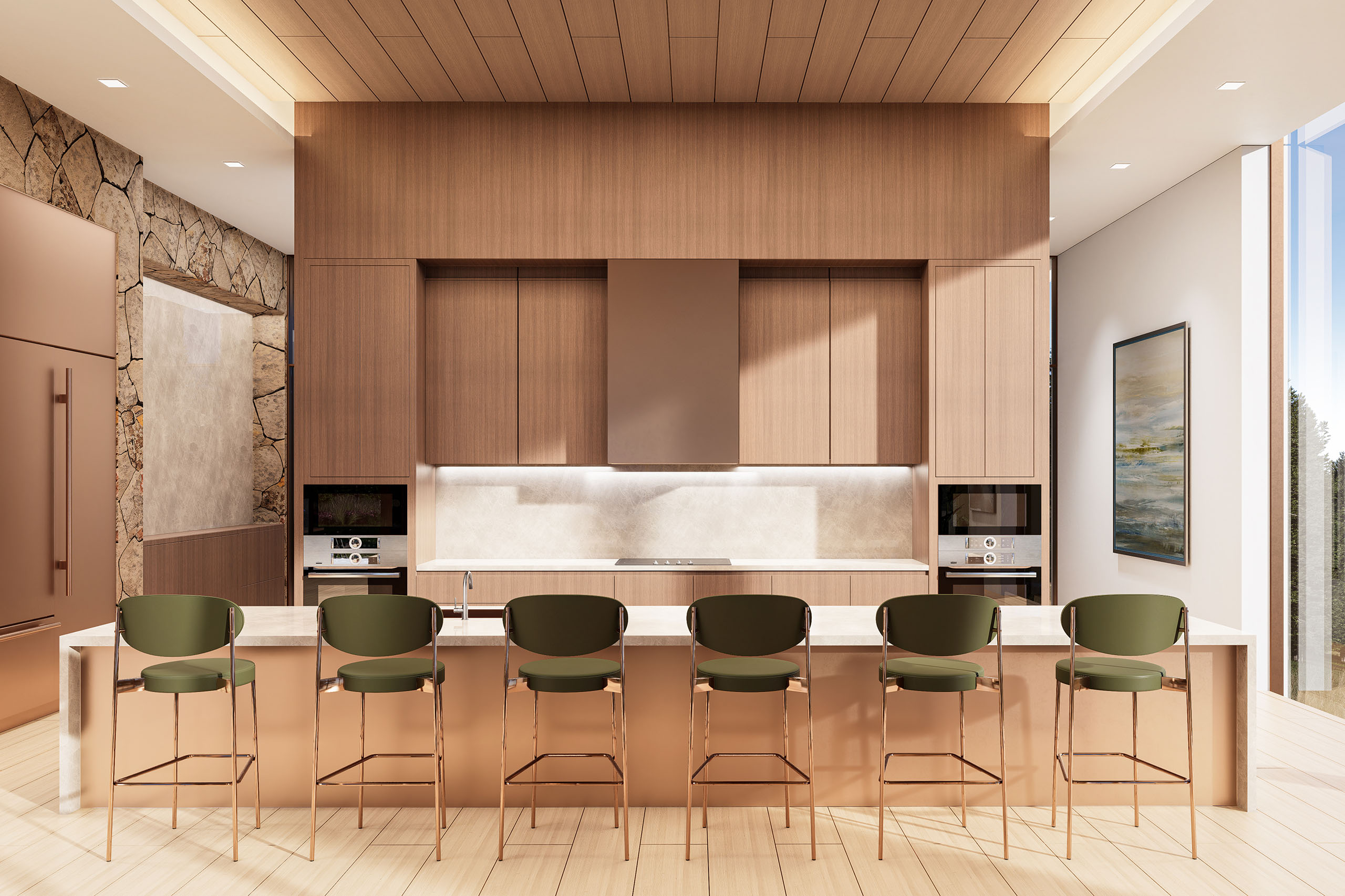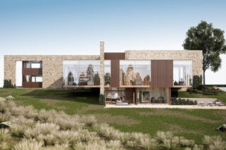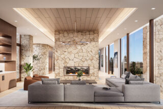 The material palette draws directly from the site’s natural context. Rough-hewn, hand-laid stone walls anchor the architecture to the ground while weaving inside and out, carrying fireplaces, terraces, and outdoor kitchens along their length. Their permanence is offset by expanses of glass that invite daylight and dissolve the boundary between interior and exterior. Wood siding and bronze accents add warmth and durability, echoing the tones of the surrounding forests and fields. Landscape terraces, rooftop gardens, and a west-facing pool deck extend the architecture into the hillside, ensuring that the home is as much about inhabiting the land as it is about inhabiting the building.