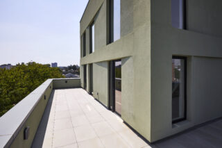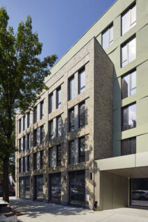Shared formal concepts create a relationship between the two sites that works independently of any alignments or repetitive moves. The first concept, Stacked Volumes, divides the overall building mass into smaller, recognizable masses that anchor the corners of the site, allowing for a bridging element to call attention to the atrium and primary building entrance. The second concept, Stepping Blocks, uses a regular module to traverse from the primary roof level to the garage roof in a consistent, patterned way, and is intended to minimize the disruption to interior layouts while allowing for roof terraces on lower floors. The overall design aims to maintain flat facades along the street walls, while recessed balconies and roof terraces are located in a larger single volume that wraps along the interior of the courtyards for easy reading of the project.